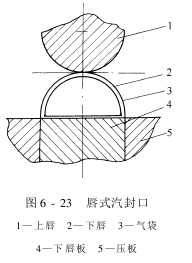 产生高温高压饱和蒸汽的首要条件是能承受肯定压力的封闭系统的存在。因此,系统的密封性是高温高压汽蒸设备的关键。它既要保证织物能连续地进出高压汽蒸箱,又要耐磨,具有肯定的寿命。如果是间歇生产,则可用静密封来解决,一般用螺栓把箱盖和箱体及填在它们之间的橡胶垫片压紧即可,如高压煮练锅。对于连续生产的高温高压汽蒸的密封,一般有唇式和辊式两种。简单的唇式密封口,是用两片四氟乙烯制成的唇式夹片,用它压触运行织物,形成密封。由于夹片和织物间的摩擦严峻,对有色织物易产生条花。在唇封上若积有污物,则将沾污织物。因此,一般不适用于高压上色和印花后织物的汽蒸。图6-23是一种常用的唇式汽封口。上唇由不锈钢制成,下唇为外包聚四氟乙烯薄膜的橡胶充气袋,袋内气压为68.6kPa,使下唇紧贴上唇,织物在其间通过,蒸汽不易外泄。