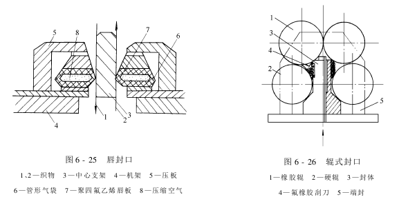 图6-26所示为一种辊式封口。其密封由面封和端封组成。面封是利用高压汽蒸箱内的蒸汽压力使聚四氟乙烯密封条压向辊面形成的,其辊间轧点压强则另有加压装置产生,以和蒸箱内压力平衡。端封则用支架螺钉把聚四氟乙烯端封片分别压在各辊的左右端面上,以达到密封。