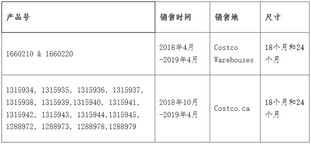 此次召回的产品于2018年4月-2019年4月在加拿大销售,此次召回涉及产品约96286件。