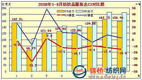 海关总署新数据显示,2009年8月我国出口纺织品服装约156.96亿美元,较2008年同期减少28.95亿美元,同比减幅15.57%,较上月减少6.77亿美元,环比减幅4.13%。其中出口纺织纱线、织物及制品51.62亿美元,较上月减少1.61亿美元,环比减幅3.02%,较2008年同期减少8.89亿美元,同比降幅14.70%;出口服装及衣着附件105.34亿美元,较上月减少5.16亿美元,环比减幅4.67%,较2008年同期减少20.06亿美元,同比降幅16.00%。