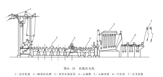 直辊丝完机由进布装置、碱液直辊浸渍槽、轧液装置、冲洗去碱槽、去碱蒸箱、平洗机、烘燥机及出布装置组成,如图6-33所示。