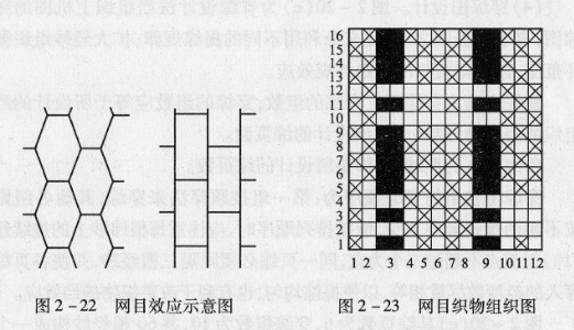 答:网目织物由网目组织构成,织物的表面呈扭曲网络状效应,如图2-22所示。