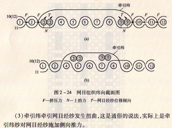 (1)由于网目经纱一侧的地经纱和牵引纬交错紧密,另一侧的地经纱和牵引纬没有交错,紧密部位的侧向挤压力推动网目经纱侧向发生位移,使它形成纵向扭曲。