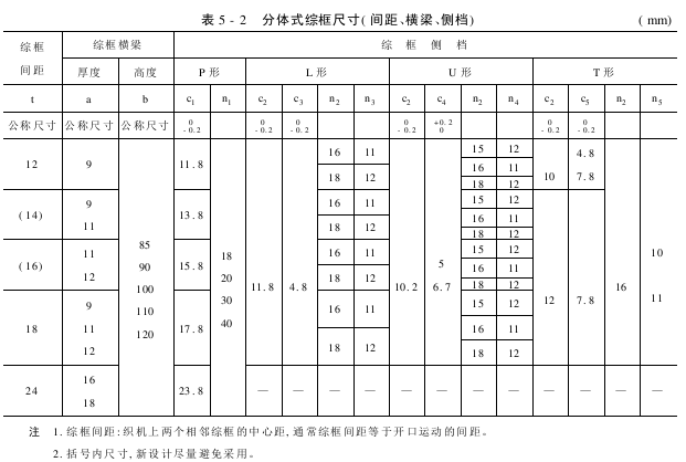 (5)综框的横梁需平直和牢固,抗拉强度σb≥240MPa。横梁的截面尺寸根据织机、织物等参数选用,确保其有足够的强度。常用截面有连体横梁、分体横梁,主要尺寸见表5-1、表5-2。