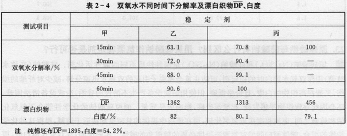 由表2 4可知,采纳稳定剂甲双氧水分解率较小,60min时分解率为90.6%;而采纳稳定剂乙双氧水在45min时已基本分解;用稳定剂丙双氧水在15min内已全部分解。从漂白织物白度和聚合度来看,稳定剂甲都比稳定剂乙、丙好。在上述三种稳定剂对比中可知,稳定剂甲效果好。同样用于轧、蒸工艺和冷轧堆也可根据工艺进行试验。