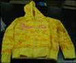 描述:该黄色拉链式连帽运动衫,印有水平线和黄色爱心图案及,胸前印有“QueenBar”字样。