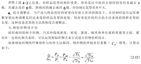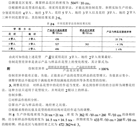 采纳这种仿制方法测量要精确,否则就会影响仿样效果,同时在修正经、纬纱排列根数时,同样要考虑到产品行型的方正要求。