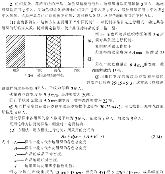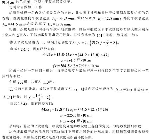 (1)对比法。这是一种简单的仿制方法,在仿样时,只要选择一块和产品的技术规格相同的成品布,将其置于被仿样品的旁边,取出样品 个花型循环,将此花型循环内的各色排列顺序分别和成品布对比,记下和各色条型、格型相对应的成品布的根数即可。