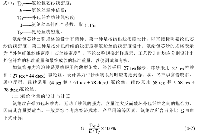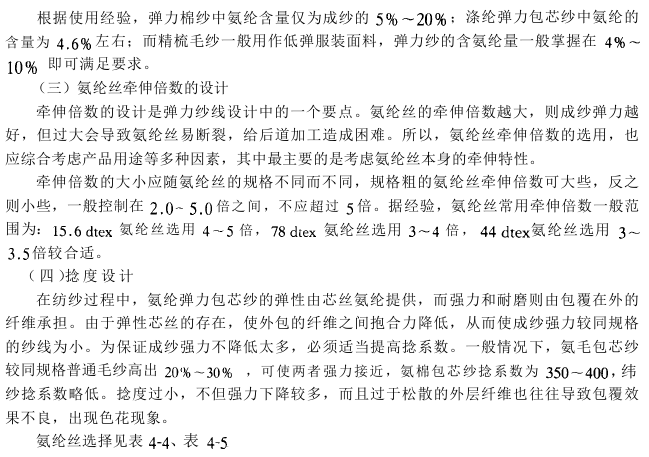 (1)产品规格设计除了使织物达到所需的风特别,还决策着织物经纬向所能得到的弹性。设计时首先要明确织物用途,确定织物所需的经纬向弹性大小,综合考虑原材料、线密度、组织、密度,以及纺纱线中氨纶牵伸倍数、氨纶含量、捻度等因素。