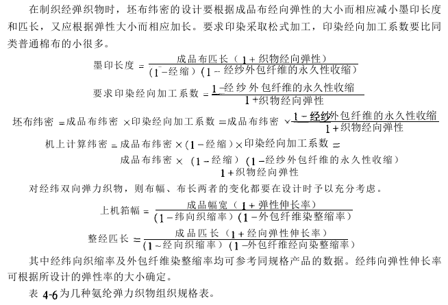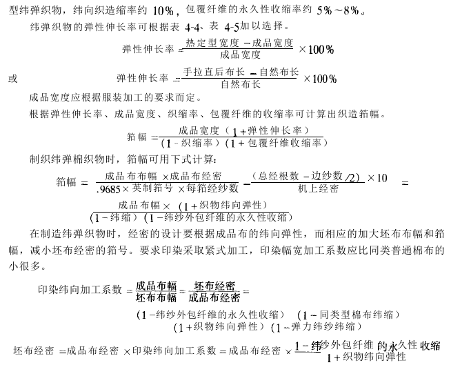 经纬密度是决策产品外观、厚度、重量、弹性、手感的重要因素,特别是弹性织物,直接影响到织物的有效宽度和缩率。密度过大,则织物过板过硬,影响舒适性;密度过小,则织物回缩过大,织物的尺寸稳定性差。如何解决这一关键性的问题,重要的原则是本色棉布的经纬密度要根据弹性伸长率或有效宽度的变化而对成品的经、纬密度作相应的改变。如果本色棉布密度过大(经弹织物主要是纬密,纬弹织物主要是经密),则织物在湿热整理中无收缩的余地,而得不到估计的弹性伸长率和手感;但密度过小,也会影响织物的内在质量。