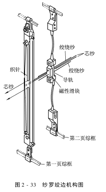 (1)机构的概要:这个装置安装在和第二页综框上。利用和第二页综框的上下休闲带动装置工作,穿在织针上的两根芯纱和穿过磁性滑块上的一对斜长孔中的两根绞缠纱,共四根纱罗纱进行绞边,如图2-33所示。