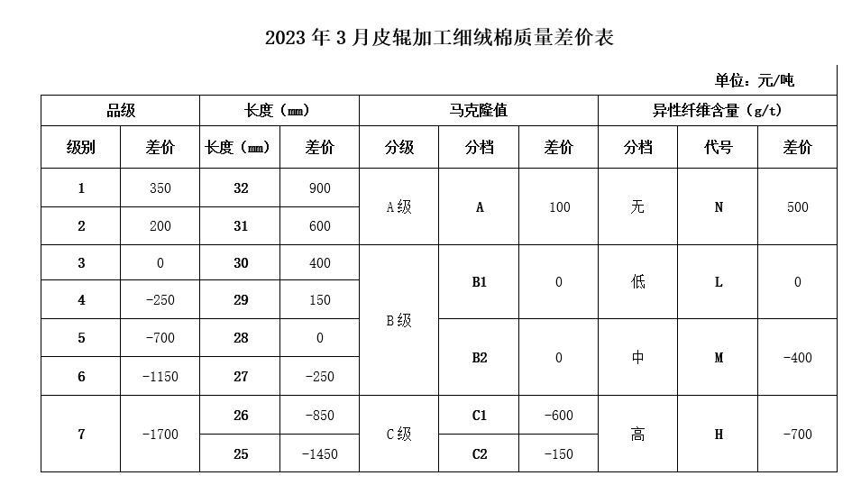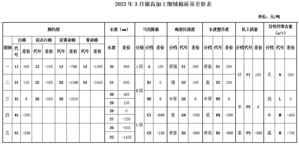依据2023年2月的棉花公检质量数据、中国棉花协会棉花质量价差自动生成系统采集的棉花加工企业销售成交价、纺织企业监测点的采集数据以及当月的中国棉花价格指数,并征求业内相关专家的意见,与上月相比,2023年3月《锯齿加工细绒棉质量差价表》、《皮辊加工细绒棉质量差价表》和《长绒棉质量差价表》保持不变。