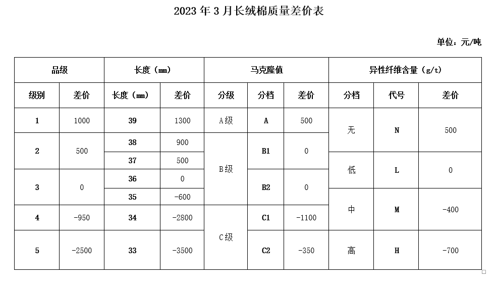 根据《中国棉花协会国产棉质量差价表管理办法》规定,现正式发布2023年3月《锯齿加工细绒棉质量差价表》、《皮辊加工细绒棉质量差价表》和《长绒棉质量差价表》(单位:元/吨)。