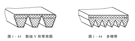 如图1-48。齿形V形带承载层为绳芯结构,内表面制成均布横向齿的V形带。它散热性好,和轮槽粘附性好,是曲挠性好的V形带。
