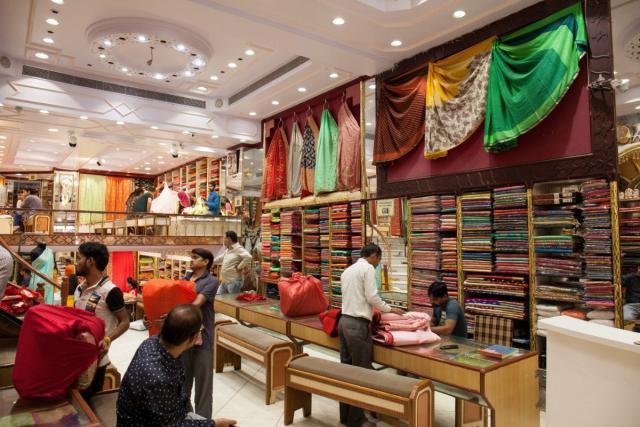 2018年印度斋普尔大巴扎内的高级布匹商店。