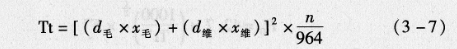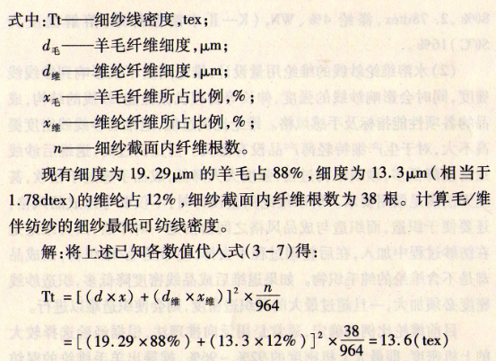 (3)水溶维纶纺纱线的线密度计算:确定纺纱线的线密度,不仅要考虑到产品的风格特征,还要考虑纺纱线的可纺性能,纱截面所含的纤维根数必须满足不少于38根的低纤维根数。水溶性维纶伴纺的纺纱线还,存在着维纶溶化前后纺纱线密度的差异问题。为此,设计水溶维纶纺纱线的特数应先根据式(3-7)推算出水溶维纶伴纺纱的低可纺线密度,然后根据生产实际情况加以调整。计算公式如式(3-7):