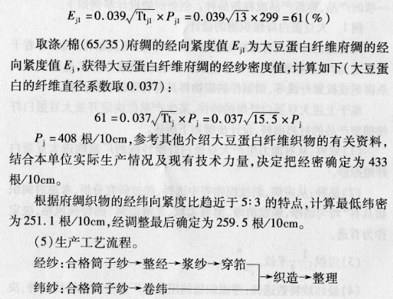 参照上述涤/棉(65/35)府绸的经向紧度(Ej1)值,计算出大豆蛋白纤维纱府绸织物的经、纬密度。