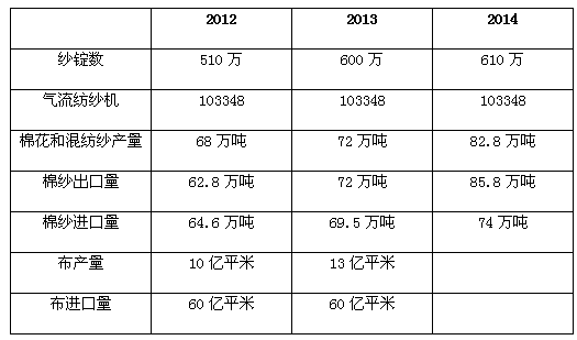 越南是亚洲为数不多近几年纺纱产能扩大的国家之一,截至2014年纺纱厂超过100家,纱锭数量为610万锭,2015年预计达到630万锭,棉纱和混纺纱的产能为82.8万吨。由于中国、土耳其和韩国的纱线需求旺盛,2014年越南棉纱达到85.8万锭的历史新高,同比增长19%。越南生产的纱线有65%用于出口,下表是越南纺织业的总体情况: