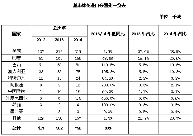 下表所示,美国仍是越南棉花进口的大来源,2014年美棉占越南棉花进口总量的29%,连续八年占据越南棉花进口的头把交椅,但印度、澳大利亚和巴西的市场份额正在迅速扩大。2014年,美棉对越南的出口量仅增长2%,为21.9万吨,印度棉对越南出口量增长了49%,巴西棉增长了110%,澳棉增长了105%。科特迪瓦、阿根廷、巴基斯坦、中国和印度尼西亚的增幅也非常明显。