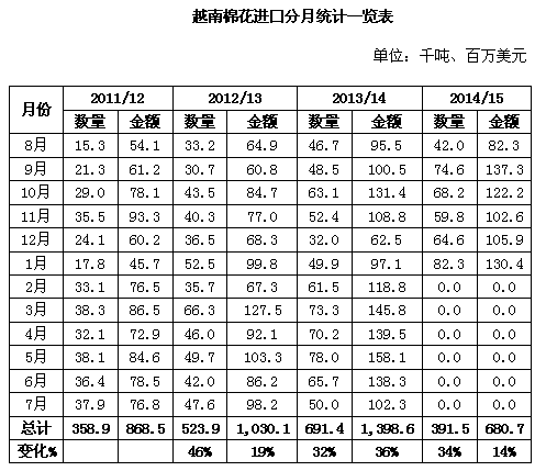按年度分析,2013/14年度越南棉花进口量为69.14万吨,进口额14亿美元,同比分别增长32%和36%。2014/15年度前6个月,越南累计进口棉花39.15万吨,进口额6.8亿美元,同比分别增长34%和14%。预计本年度越南棉花进口总量将达到83万吨,同比增长20%,主要原因是国内纺纱生产继续扩大和纱线出口需求持续旺盛。