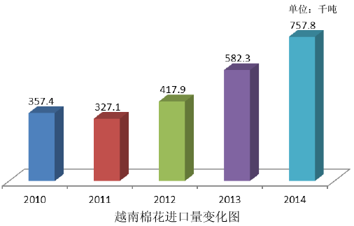 由于国际市场(主要是中国)的纱线需求旺盛,越南棉花进口量持续增加。2014年,越南棉花进口量同比增长30%,达到75.78万吨,货值14.5亿美元。在中国棉纱进口快速增长、越南加入欧盟TPP和FTA协议等诸多利好的促进下,2015年越南棉花进口量预计达到91万吨,同比增长20%。