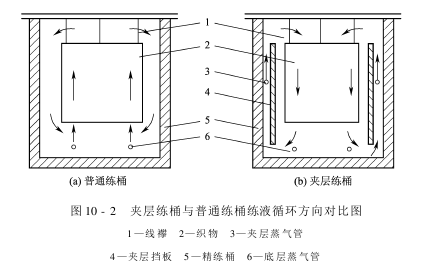 ②夹层练桶:当练桶底部的蒸汽管加热时,练液上升,使织物浮起,产生擦伤和折皱印,且练桶上下存在温差,可以采纳夹层练桶。夹层练桶是在一般练桶的两边距桶壁4~5cm处,加装一块约2mm的不锈钢挡板。挡板下沿距桶底约20~30cm,使和桶壁间形成夹层。挡板上沿浸没在液面之下,略高于织物上沿。在每边挡板和桶壁的适当位置安放一根直接蒸汽管。织物精练时,关闭底汽,仅用夹层蒸汽保温。由于夹层蒸汽管的蒸汽喷出口都向上,蒸汽喷出时,驱使练液由底部涌入夹层,从夹层的上口溢出,流向练桶中心,形成自上而下的流向。这同原来使用底层蒸汽管时的自下而上的练液流向恰好相反。但夹层练桶使用不当时,也可能使液流出现“短路”,即液流不从每匹织物页间穿过,而从匹和匹间流过,并使织物各页闭合,反而影响精练均匀程度。