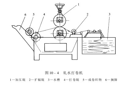 ②轧水打卷:轧水打卷机由水槽、扩幅辊、轧水辊和传动装置等组成,见图10-4。轧水是在平幅轧水机上进行的。操作时两辊自然接触,织物需预先缝接好,依次无压地浸在清水池内,然后平坦无皱地通过轧点被卷在卷布轴上,桑蚕丝薄织物一般不加压水辊,预防坯绸产生松紧,经轧水机后造成压刹印疵病。所以,轧水工艺实为打卷。较厚的织物等可加压水辊,一般用于纺类、斜纹类、缎类织物。它可以预防皱印,但简单产生卷边和皱条等疵病。