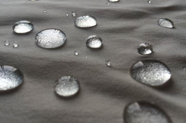 防泼水:织物的泼水特性,是指织物经过泼水剂非常处理,其表面可使水滴形成圆珠状,不会产生渗透、扩散而弄湿衣物,达到像荷叶般的泼水功能(莲花效应)。防泼水整理正是利用这一原理,以各种化学材料在布料表面附着一层超细的“针床”,使布料表面的张力小于水的内聚力,因此水滴落后会形成水珠滚开,而不是摊开浸湿。如果这层针床结构被压平或遭油污覆盖渗入,布料的防泼水能力就会大幅度降低,甚至开始吸水。