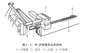 升/开梭器的总体结构如图4-6所示,完成引纬工作的片梭从织机右侧的接梭箱中被推出,并被送入回梭链上,织机每转动一周,回梭链上的一个链节2就会把一只片梭3推入升梭器1里,然后开梭器4开始伸入位于升梭器1里的片梭3的孔中,使梭夹的钳口逐步打开,同时,升梭器1和开梭器4一起向上转动,把纱夹张开的片梭3由垂直位置升到水平的投梭位置。随后开梭器4就开始下降,使片梭的纱夹闭合,把递纬夹送来的纬纱的头端夹住。当片梭3离开升梭器1后,升梭器1就会向下转动,由水平的投梭位置再次回到垂直位置,以接受回梭链送来的另一只片梭。