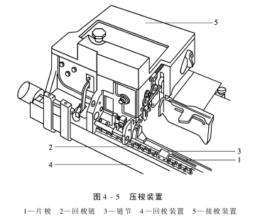 压梭装置如图4-5所示,片梭织机每转动一周,压梭装置将一只片梭1从接梭装置5压入回梭装置4,使片梭进入回梭链2的两个链节3之间。如果需要改变织有效宽度度,则需移动接梭装置5相对于不断移动的回梭链2的回梭链节3的位置。