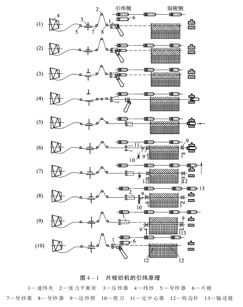 (10)递纬夹回复到纬纱交接位置:这时,递纬夹1再次回到左侧位置,即和梭夹发生纬纱交接的位置。张力平衡杆2上升到高位置,使纬纱保持张紧,由边纱钳9所夹持的纬纱头则被左右两只钩边针12钩入梭口中,形成布边。和此同时,在引纬侧又有一只片梭开始从输送链13送向引纬位置。