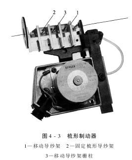 (2)梳形制动器制动装置:如图4-3所示,梳形制动器制动装置是靠移动导纱架1下移,使纬纱在移动导纱架栅柱3和固定梳形导纱架2的导纱孔之间折绕,从而对纬纱产生肯定的制动阻力。这种制动装置的特点是:对纬纱的制动作用缓和柔和;每种纬纱的制动力可单独编程操纵;纬纱接触的是高耐磨陶瓷导纱件。