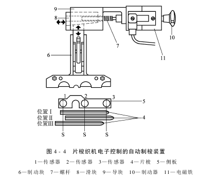 7.电子操纵自动制梭装置 片梭织机电子操纵自动制梭装置及片梭的三种不同定位位置如图4-4所示。当片梭4进入接梭箱处于正常的定位位置Ⅰ时,这时片梭同时遮住传感器1和3的开关坐标S,电子操纵自动制梭装置的自动调节部分没有反应。