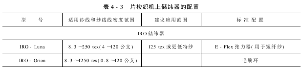 随着片梭织机引纬速度的提高,储纬器已经成为必不可少的保证纬纱顺利地从筒子上退绕和引入梭口的工具。表4-3是P7300型片梭织机上储纬器的配置。