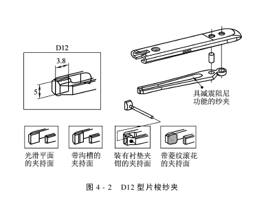 D12型片梭纱夹具有减震阻尼功能,纱夹的夹持面有完滑平面的夹持面,带沟槽的夹持面,装有衬垫夹钳的夹持面,带有菱纹滚花的夹持面。如图4-2所示。