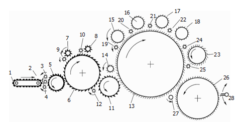 (3)在主体梳理部分,在开松锡林6和大锡林13之间有运输辊11,它和开松锡林和大锡林之间都有剥取作用。在大锡林上有五个工作辊14,15,16,17,18和四个剥取罗拉。在每个工作辊旁都装了一个剥取罗拉。大锡林带着毛层走到道夫26处。大锡林把一部分梳好的纤维交给道夫。