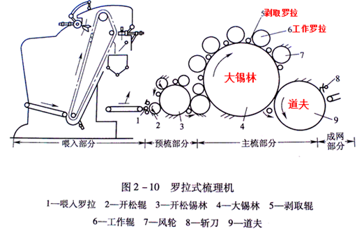 2.罗拉式梳理机罗拉式梳理机适合于梳理长度大于51mm的较长纤维。