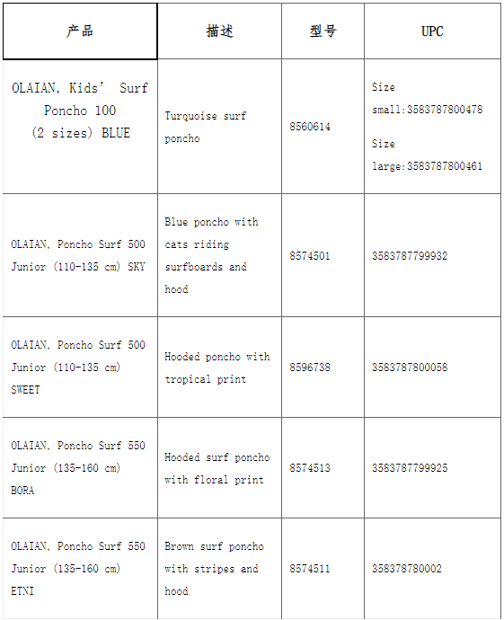 更多详情参见://recalls-rappels.canada.ca/en/alert-recall/olaian-kids-surf-ponchos-recalled-due-flammability-hazard