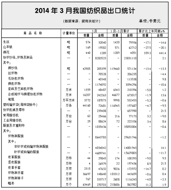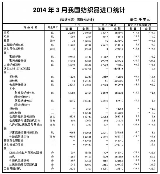 一季度,全国纺织品进口48.1亿美元,与2013年同期相比增长1.9%;服装进口14.3亿美元,增长21.7%。纺织品中,纱线和制成品进口保持增长,面料进口则出现下降。