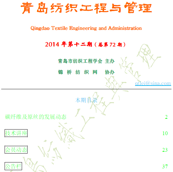 由青岛市面料工程学会主办、面料网协办的《青岛面料工程和治理》电子期刊于2009年1月正式创刊。该刊由青岛市布料工程学会秦志强工程师任主编。该刊除以电子邮件形式发送至会员单位外,还在面料网开设特意窗口供业内人士进行扫瞄和查阅。该刊的创办定能为广大布料业技术人员提供1个技术交流平台,为我国面料业技术创新起到积极作用。