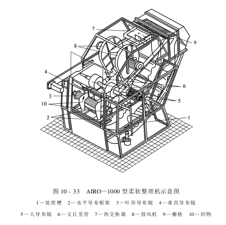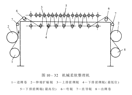 织物机械柔软后整理的方法较多,可在单辊筒后整理机上轻轧或在拉幅机上轻微拉幅,也可用专用的机械柔软后整理机,如图10-32所示。