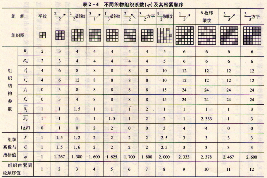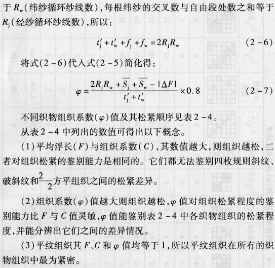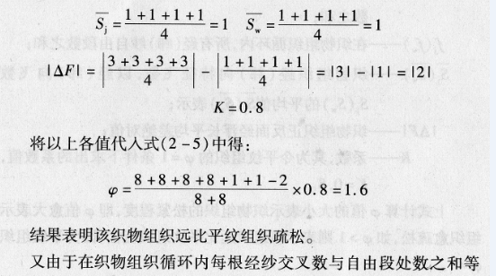 答:组织系数妒可鉴别织物组织的松紧程度,以式(2-5)计算: