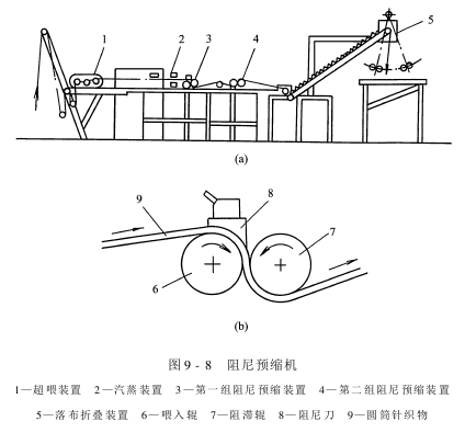 阻尼预缩机由进布汽蒸、预缩和出布部分组成,如图9-8所示。