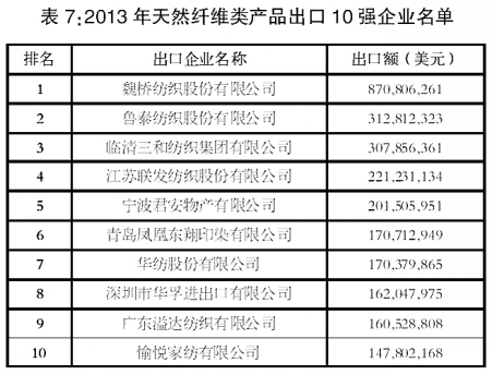 从出口企业情况来看,我国天然纤维类产品出口集中度较低,出口额排名前10位企业出口额合计占同期出口总额的11.8%。(详见表7)