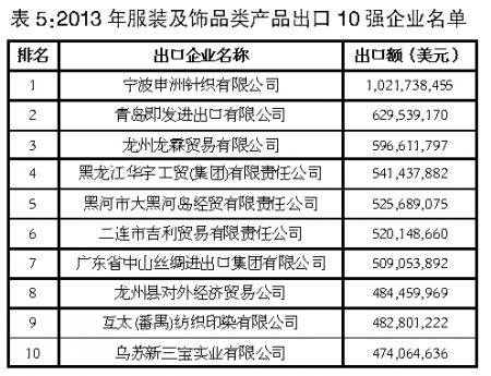 从出口企业情况看,我国服装及饰品类产品出口集中度与纺织原料类产品相比更为分散,出口额排名前10位企业出口额合计仅占同期出口总额的2.6%。(详见表5)