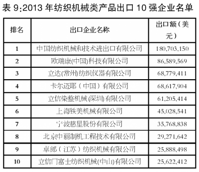 从出口企业情况来看,我国纺织机械类产品出口集中度相对较高,出口额排名前10位企业出口额合计占同期我国纺织机械类产品出口总额的24.9%。(详见表9)