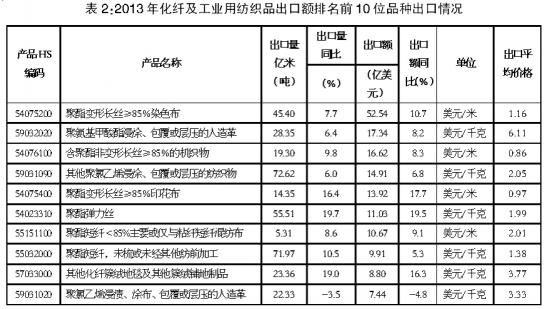 从化纤及工业用纺织品出口的主要品种来看,聚酯类品种出口额居前,出口额在10亿美元以上的品种总共有7种。(详见表2)