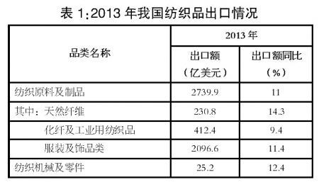 据海关信息网数据显示,2013年我国共出口纺织原料及制品2739.9亿美元,比上一年同期增长11%。其中,天然纤维类产品出口230.8亿美元,比上一年同期增长14.3%;化纤及工业用纺织品类产品出口412.4亿美元,比上一年同期增长9.4%;服装及饰品类产品出口2096.6亿美元,比上一年同期增长11.4%。另外,2013年我国纺织机械产品出口额为25.2亿美元,比上一年同期增长12.4%。(详见表1)