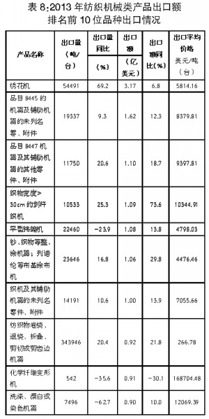 2013年,我国对印度出口纺织机械产品4.6亿美元,增长11.7%;对印尼出口2.3亿美元,增长9.6%;对越南出口2亿美元,增长92.4%。对以上市场出口额合计占同期纺织机械类产品出口总额的35.2%。(详见表8)