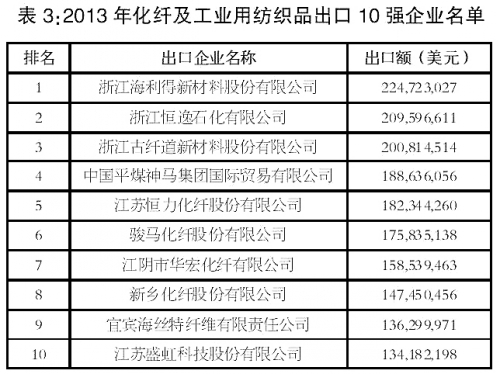从出口企业情况来看,我国化纤及工业用纺织产品出口集中度较低,出口额排名前10位企业出口额合计仅占同期出口总额的4.3%。(详见表3)